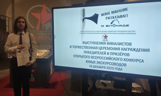 16 декабря в Мемориальном музее обороны и блокады Ленинграда состоялся финал Открытого Всероссийского конкурса юных экскурсоводов «Новое поколение рассказывает о блокаде», посвящённого 60-летию присвоению Ленинграду звания «Город-Герой». Одним из финалистов стал учащийся кружка ОДОД «Прогулки по Петербургу» Тимур Жумаев (9Б). Затем для финалистов была проведена автобусная экскурсия по Петербургу.
