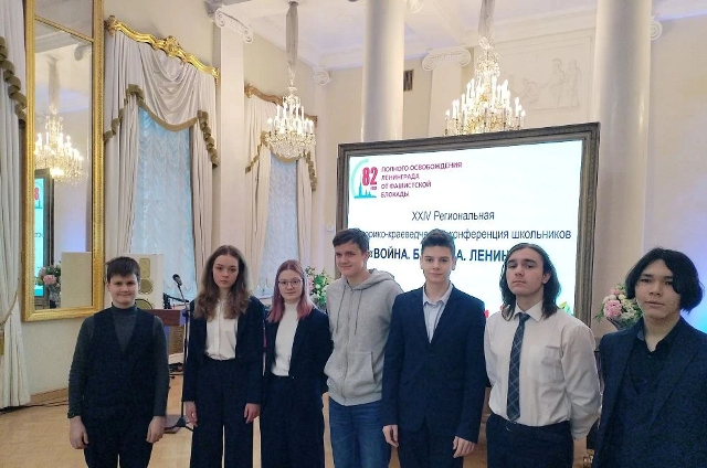 24 января в Аничковом дворце состоялась ХХIV Региональная историко-краеведческая конференция школьников «Война. Блокада. Ленинград», в которой приняли участие наши учащиеся: Георгий Шурухнов (5А), Ярослав Белозёров и Анастасия Кавокина (7Б), Вероника Чурсанова (8А), Георгий Филин (8Б), Тимур Жумаев (9Б). Также конференцию в качестве слушателя посетил Даниил Болотов (8А).