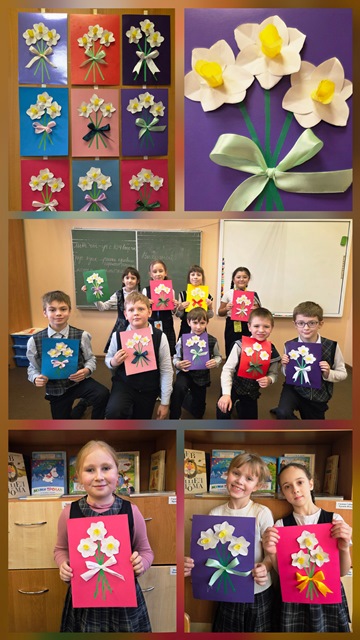 Наши мамы удивительные! Кто, как не они, любит нас просто за то, что мы есть? Кто, как не они, бескорыстно радуется нашим успехам? Кто, как не они, отдаст за нас жизнь, если понадобится? В международный женский день 8 Марта мы от души благодарим наших замечательных мам и, конечно, бабушек за их золотые сердца и руки! А заодно поздравляем и наших сестрёнок! Ребята из группы продленного дня 1а и 2б классов к этому дню приготовили весенние букеты нарциссов на цветном картоне - появились удивительные открытки с объёмными цветами, которые трудно отличить от настоящих!